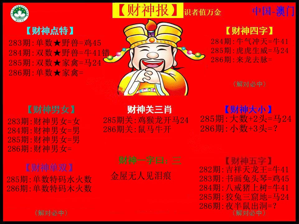 第287期 | 狗-猴-虎-蛇 | 开:?00准 |